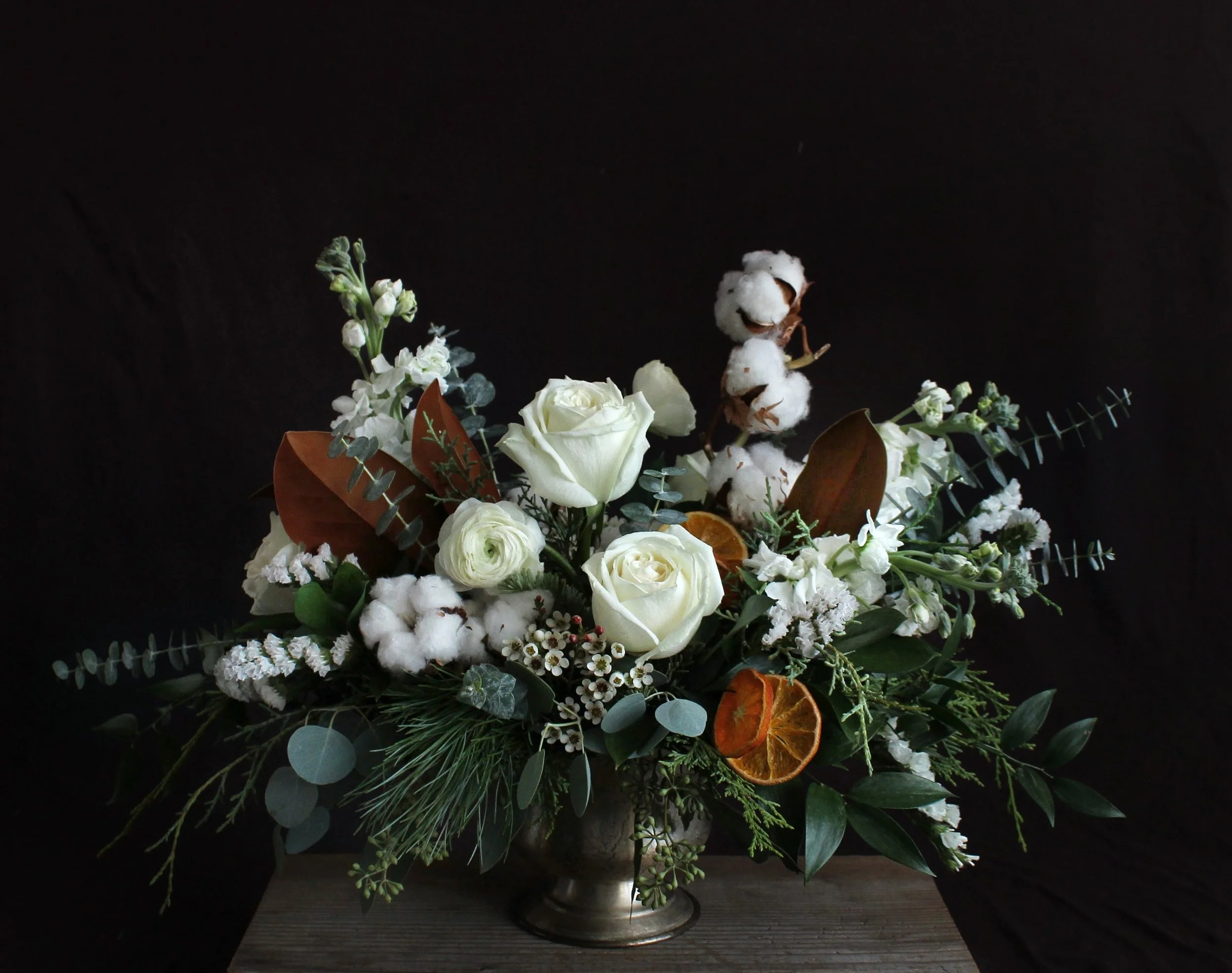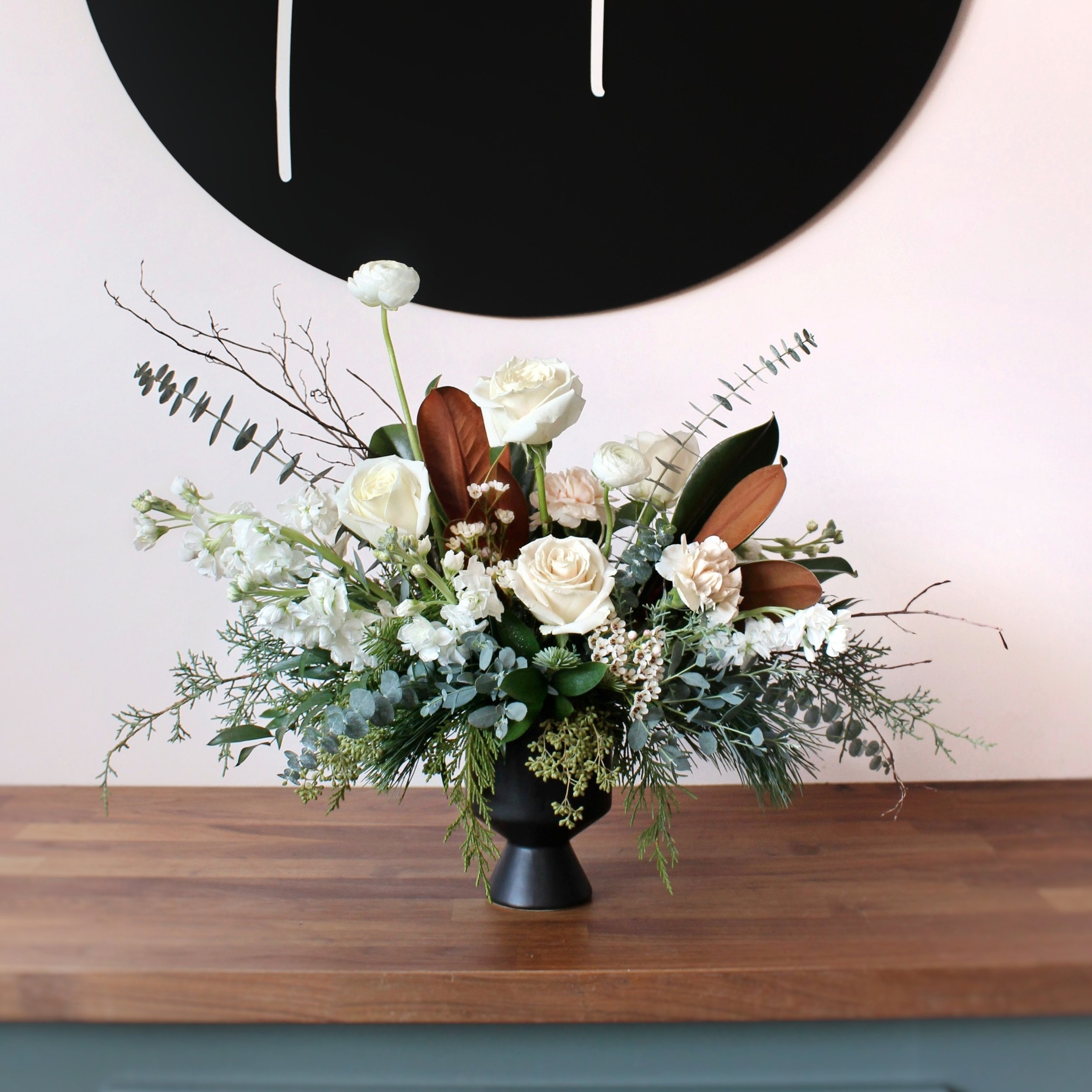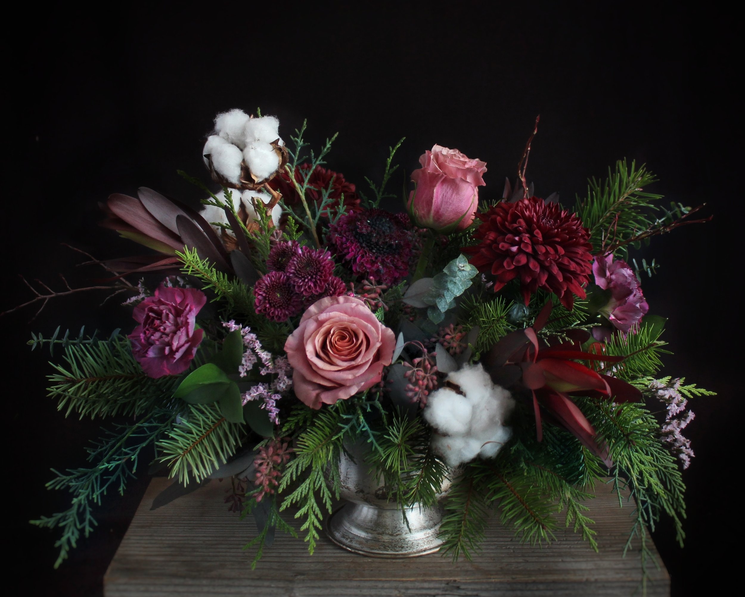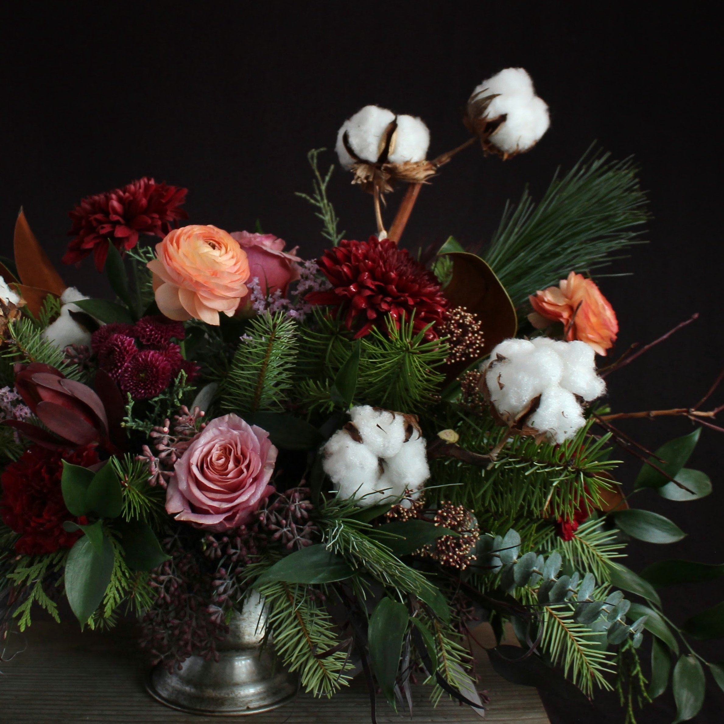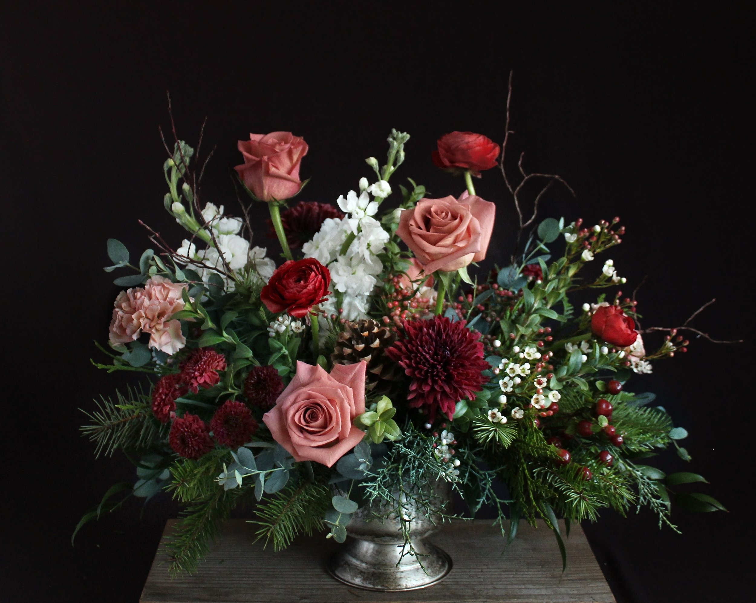Centrepiece/Arrangement - mid-sized, designed in a beautiful ceramic pedestal compote or mercury glass vessel. A classic Poetica holiday arrangement.