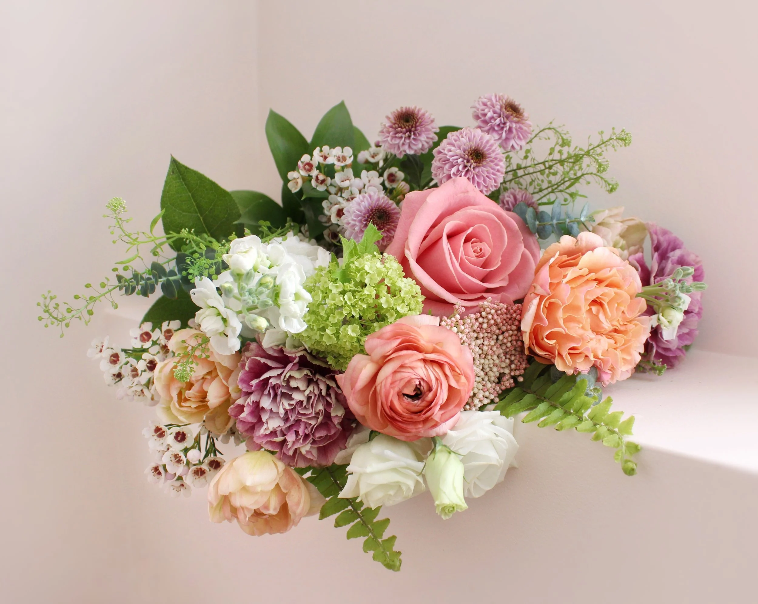 Featuring fresh seasonal blooms in an elegant colour palette with shades of blush, peach, soft sienna, pink, cream, mauve, lavender and white.
